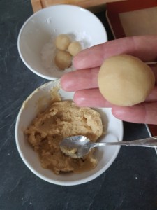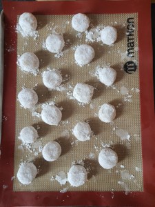 - Avec vos mains légèrement humide, former de petites boules puis les rouler dans le sucre glace.