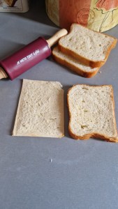 • Aplatir les 5 tranches de brioche au rouleau pour qu’elles soient plus fines et plus faciles à superposer.