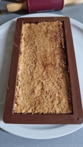 Matériels : moule à tablette de chocolat (dimensions intérieures : 22,5 cm x 10,5 cm, profondeur 1,5 cm), maryse, pinceau alimentaire, rouleau à pâtisserie, bain-marie.