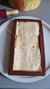 • Déposer une première couche de brioche (en utilisant 2 tranches et demie par étage) dans le moule sur la coque en chocolat noir.