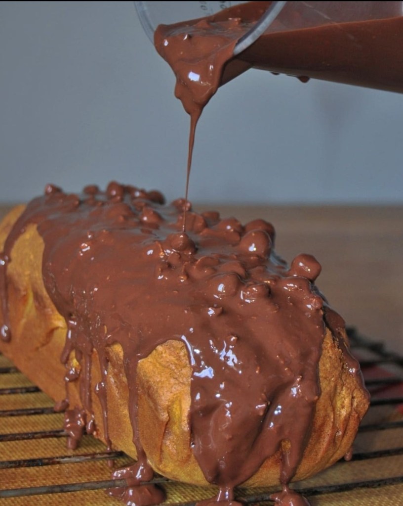 - Poser le cake sur une grille au dessus d’un récipient et verser le glaçage rocher pour l’enrober complètement.