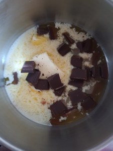 - Au bain-marie, faire fondre 150g de chocolat noir pâtissier et 180g de beurre, le tout coupé en morceaux, jusqu’à ce que le mélange soit lisse.
