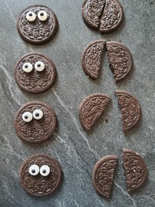 - Faire fondre rapidement au micro-ondes 2 carrés de chocolat noir et déposer deux pointes de chocolat fondu sur les 6 biscuit Oreo entier. Placer les yeux dessus.