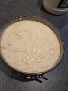 - Verser la pâte dans le moule à manqué (à charnière pour moi) préalablement beurré et fariné de 20cm de diamètre.