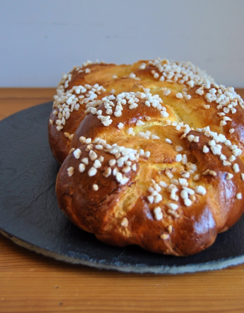 Cette brioche est parfumée à la fleur d’oranger ce qui lui donne une saveur unique et délicieusement parfumée. Les petits sucres perlés qui recouvrent la brioche apportent une texture croquante et sucrée, contrastant parfaitement avec la mie moelleuse et aérée de la brioche.