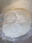 - Dans un saladier, mélanger rapidement au fouet 100g de poudre d’amandes, 60g de maïzena, 70g de sucre glace et 1 pincée de levure chimique.
