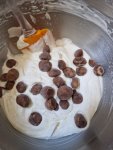 • Incorporer ensuite 125g de farine, 90g de pépites de chocolat noir et mélanger une dernière fois.