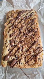 Comme pour tous les gâteaux, le blondie laisse une place importante à notre créativité. J’ai alors opté pour une pâte à blondie délicieusement vanillée, agrémentée de brisures de biscuits Nutella, de quelques pépites de chocolat pour une texture fondante, et pour couronner le tout, un léger nappage Nutella pour une touche de gourmandise supplémentaire.