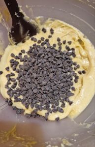• Incorporer 60g de pépites de chocolat et mélanger rapidement. (les 15g restant serviront après)