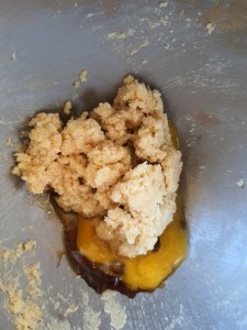 - Ajouter 80 g de cassonade ou vergoise, 80 g de sucre en poudre et mélanger. Puis 1 oeuf, 1 c.à.c d’extrait de vanille et mélanger de nouveau.