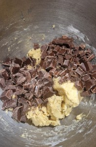 Elle a ajouté des morceaux découpés d’une tablette de chocolat mi-sucrée de chocolat dans un cookie.
