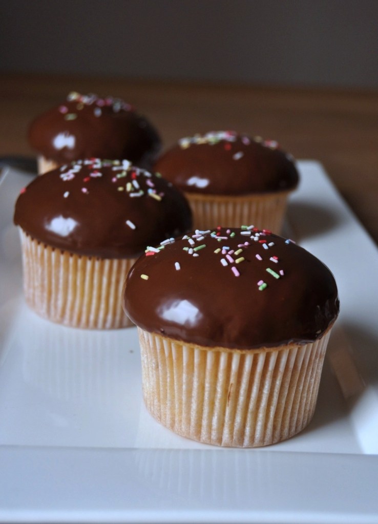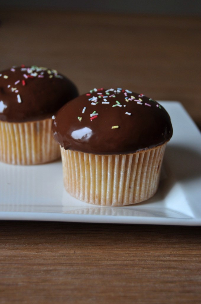 - Plonger la tête des muffins dans le chocolat fondu et secouer le délicatement pour retirer l’excédent de chocolat.