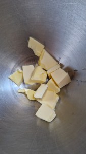 • Dans le bol du robot pâtissier muni de la feuille OU dans un saladier, travailler 60g de beurre coupé en morceaux pour le rendre pommade.