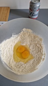• Ajouter 220ml de bière progressivement en mélangeant jusqu’à obtenir une pâte lisse.