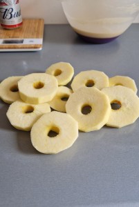 • Pendant que l’huile chauffe, éplucher, évider et couper les 3 pommes en rondelles assez épaisses.