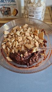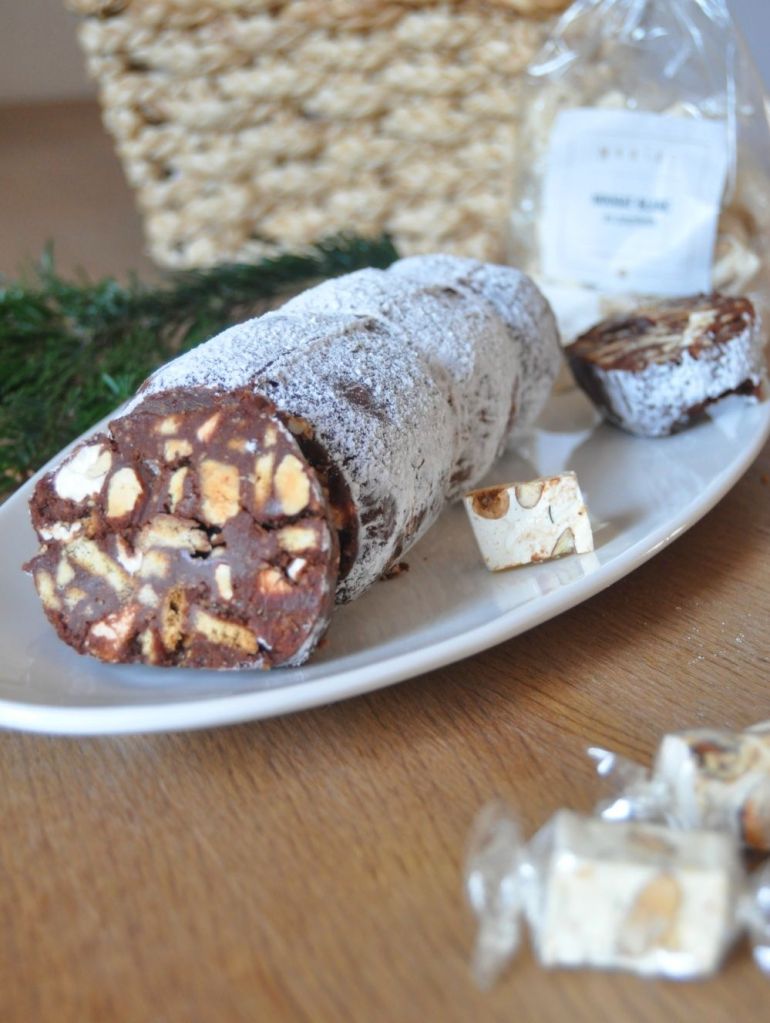 La recette de base est composée de cacao, de biscuits cassés, de beurre, d’œufs et, parfois, d’une touche de rhum. Dans ma version, j’ai ajouté des morceaux de nougat tendre et des amandes concassées pour une touche encore plus festive et gourmande. À la maison, nous avons adoré cette déclinaison !