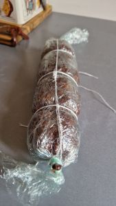 - Avec de la ficelle, ficeler le saucisson en l’entourant tout d’abord sur la longueur avec 2 ficelles bien serrées puis donner des tours de ficelle individuels sur la circonférence.