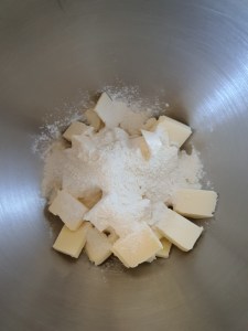 • Dans le bol robot pâtissier muni de la feuille, mélanger  200g de beurre mou coupé en cubes et 80g de farine 5 min jusqu’à obtenir une texture homogène ou la farine est bien incorporée.