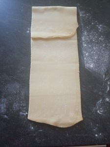 • Sur un plan de travail fariné, faire un tour double : placer la soudure verticale à droite et étaler la pâte de façon à ce qu’elle soit trois fois plus longue que large (60 x 20 cm).