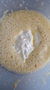 • Ajouter 1 yaourt nature (125 g) au mélange œufs-sucre et fouetter bien.