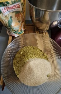- Dans un saladier, verser 200 g de poudre de pistaches, 100 g de sucre blond, 2 pincées de fleur de sel et 2 c.à.c de fleur d’oranger. Mélanger le tout rapidement et réserver.