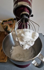 - Monter 2 blancs d’œufs en neige bien ferme avec 1 pincée de sel, à l’aide d’un fouet électrique ou d’un robot pâtissier muni du fouet.