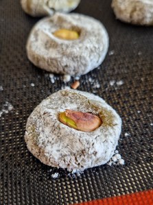 - Retirer les coques des pistaches et en placer une au centre de chaque amaretti, en appuyant légèrement.