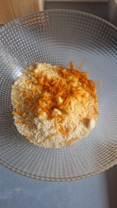 • Verser le mélange jaunes-sucre dans le saladier contenant la poudre d’amande et les agrumes.