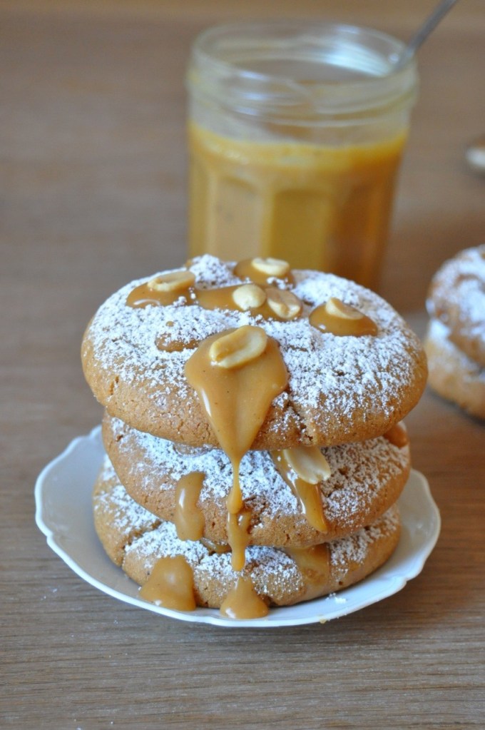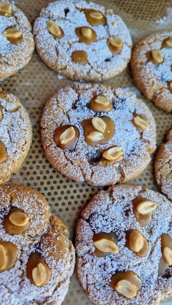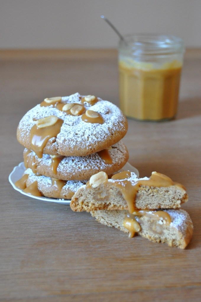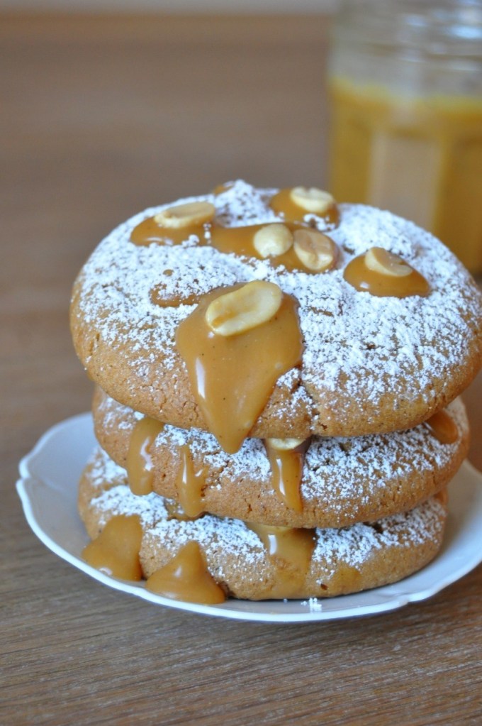 Ces cookies sont une petite merveille. Le goût est vraiment fabuleux ! La pâte, préparée avec du beurre noisette, du sucre vergeoise et de la vanille, a un goût vraiment prononcé et c’est clairement ce qui fait toute la différence. Déjà délicieuse à elle seule… et puis il y a le caramel, à l’intérieur et sur le dessus, qui vient rendre ces cookies, pourtant assez simples en apparence, incroyablement gourmands. Sur chaque pointe de caramel déposée sur le dessus, j’ai posé une petite cacahuète, juste pour le croquant et le plaisir supplémentaire.