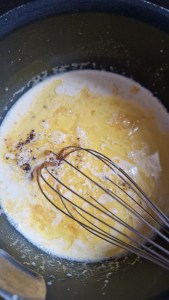 • Incorporer 20 cl de crème légèrement tiédie (attention aux projections), ainsi que les graines de vanille ou l’extrait et mélanger jusqu’à homogénéité.